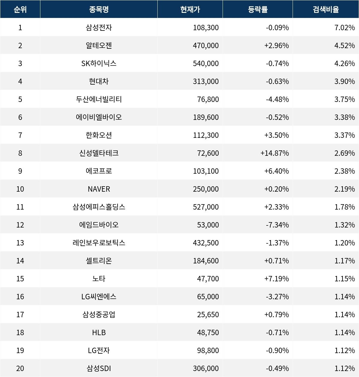 이 밖에도 삼성에피스홀딩스(0126Z0) ▲2.33%, 에임드바이오(0009K0) ▼7.34%, 레인보우로보틱스(277810) ▼1.37%, 셀트리온(068270) ▲0.71%, 노타(486990) ▲7.19%, LG씨엔에스(064400) ▼3.27%, 삼성중공업(010140) ▲0.79%, HLB(028300) ▼0.71%, LG전자(066570) ▼0.90%, 삼성SDI(006400) ▼0.49% 등이 많이 검색되고 있다.