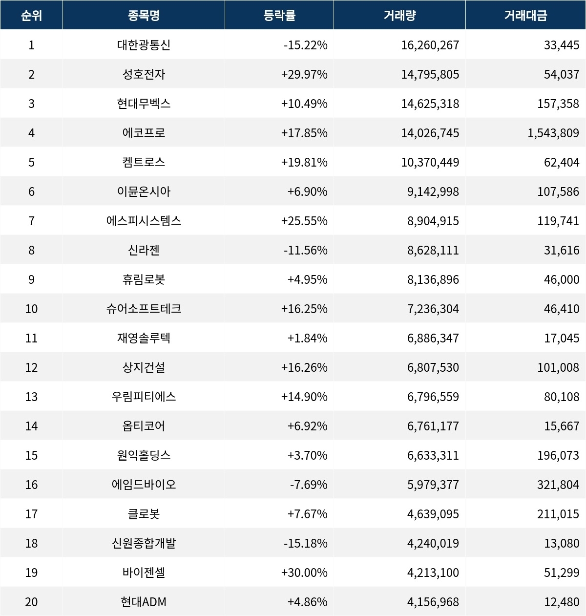 한편 거래량 상위 20위권 종목들은 재영솔루텍(049630) ▲1.84%, 상지건설(042940) ▲16.26%, 우림피티에스(101170) ▲14.90%, 옵티코어(380540) ▲6.92%, 원익홀딩스(030530) ▲3.70%, 에임드바이오(0009K0) ▼7.69%, 클로봇(466100) ▲7.67%, 신원종합개발(017000) ▼15.18%, 바이젠셀(308080) ▲30.00%, 현대ADM(187660) ▲4.86% 등의 성적을 기록했다.