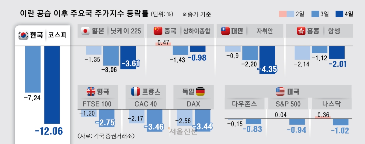 미국의 이란 공습 충격파가 한국 금융시장을 타격하면서 한국 경제가 패닉에 빠졌다. 주가 폭락·환율 상승·국제유가 급등 여파가 실물경제에 ‘도미노 충격’으로 전이돼 경제 전반에 ‘퍼펙트 스톰’(복합위기)이 몰아칠 가능성까지 거론된다. 코스피는 4일 전 세계에서 가장 큰 낙폭(-12.06%)을 기록했다. 일본 닛케이225지수는 3.61%, 중국 상하이종합지수는 0.98%, 대만 자취안지수는 4.35% 내리는 데 그쳤다.