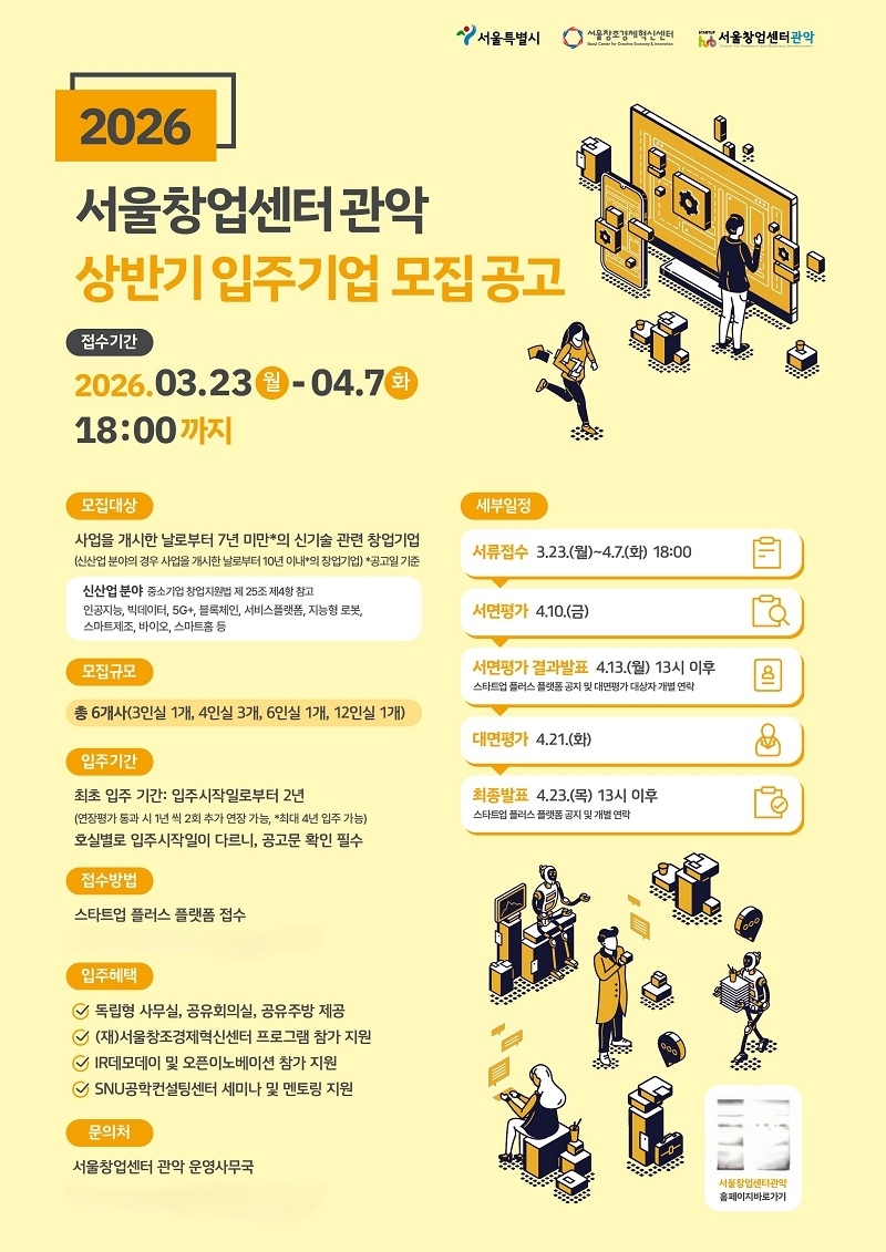 상반기 입주 기업 모집 공고는 서울창업센터 관악-스타트업 플러스 누리집, K-스타트업 창업 지원 포털(K-Startup), 재단법인 서울창조경제혁신센터 누리집에서 확인할 수 있다.