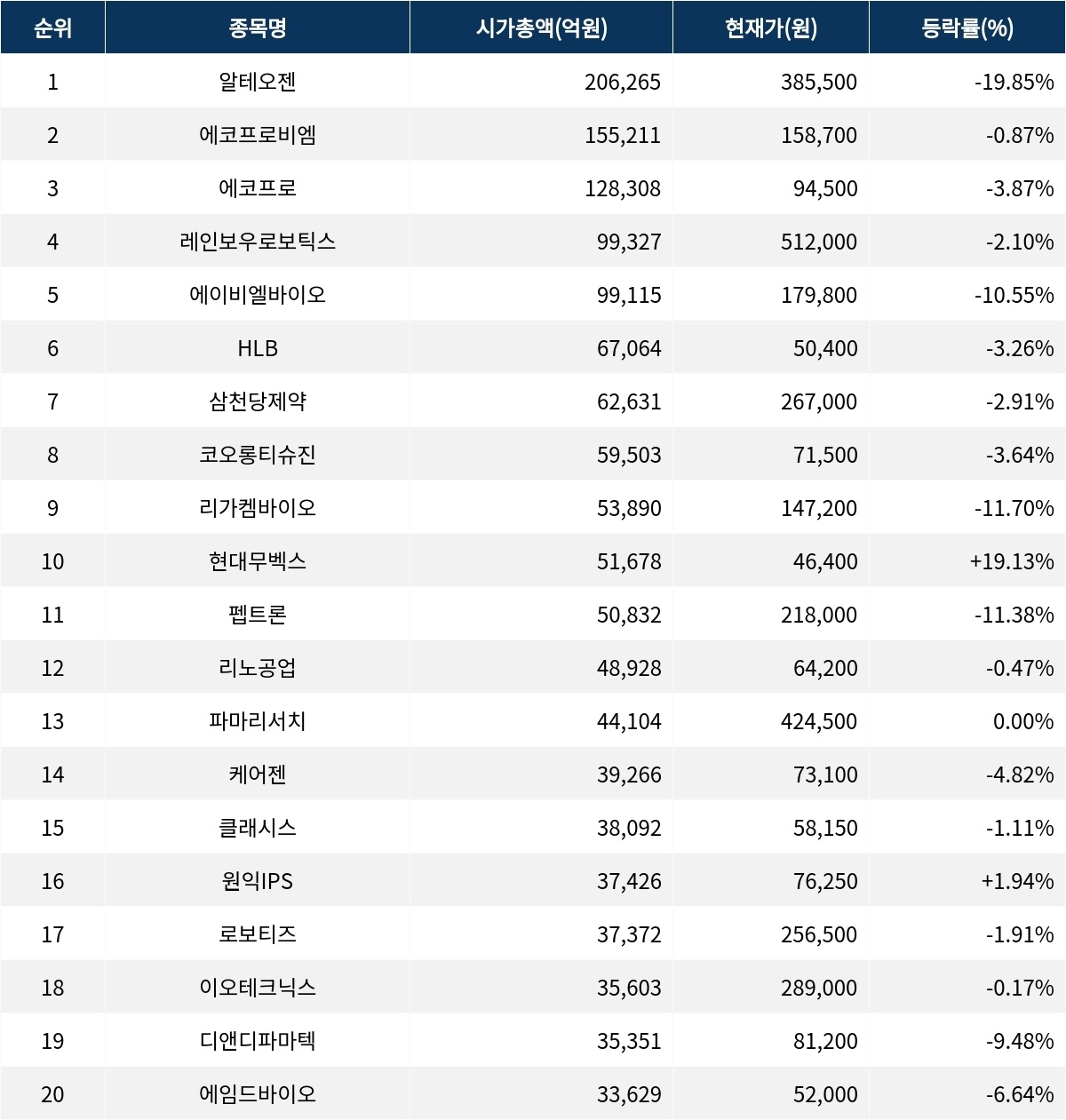 시가총액 3위부터 10위까지의 종목들은 에코프로(086520) -3.87%, 레인보우로보틱스(277810) -2.10%, 에이비엘바이오(298380) -10.55%, HLB(028300) -3.26%, 삼천당제약(000250) -2.91%, 코오롱티슈진(950160) -3.64%, 리가켐바이오(141080) -11.70%, 현대무벡스(319400) +19.13% 등의 등락률을 기록하고 있다.