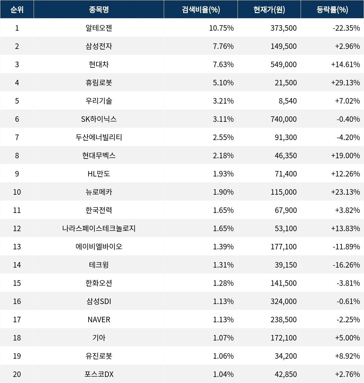 이 밖에도 한국전력(015760) ▲3.82%, 나라스페이스테크놀로지(478340) ▲13.83%, 에이비엘바이오(298380) ▼11.89%, 테크윙(089030) ▼16.26%, 한화오션(042660) ▼3.81%, 삼성SDI(006400) ▼0.61%, NAVER(035420) ▼2.25%, 기아(000270) ▲5.00%, 유진로봇(056080) ▲8.92%, 포스코DX(022100) ▲2.76% 등이 많이 검색되고 있다.