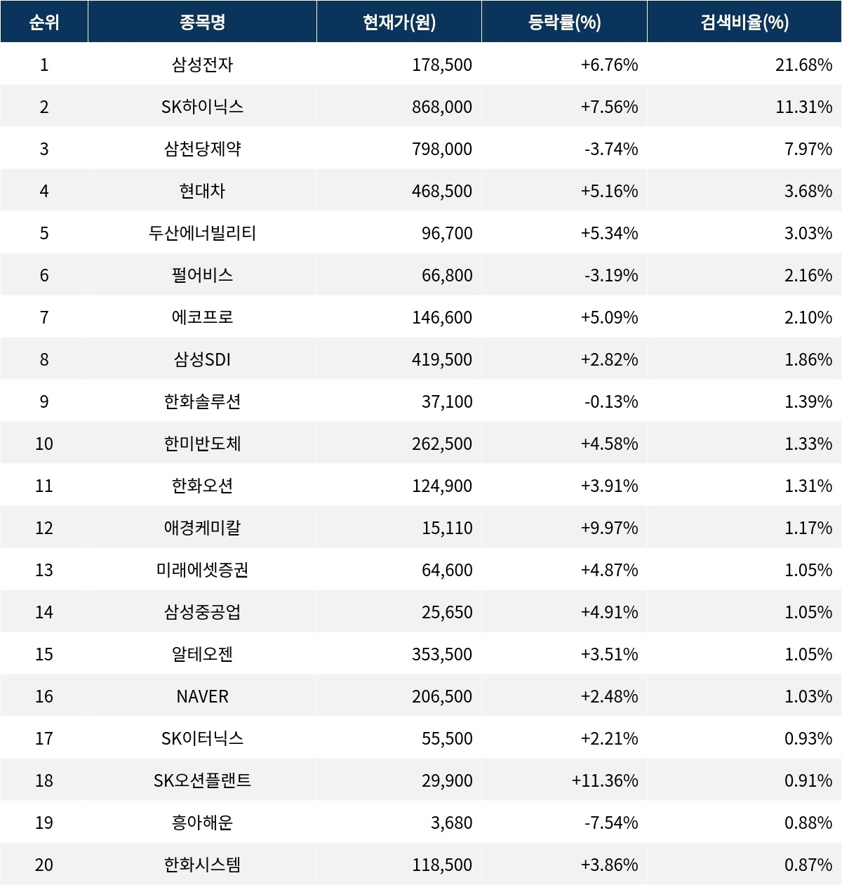 이어 SK하이닉스(000660)가 검색 비율 2위를 기록하며 7.56%의 상승세를 기록하고 있다. 검색 비율 3위의 삼천당제약(000250)은 -3.74% 하락하며 부진한 출발을 보인다. 검색 비율 4위 현대차(005380)는 개장 초반부터 5.16% 상승하며 긍정적인 흐름을 이어가고 있다. 검색 비율 5위 두산에너빌리티(034020)는 5.34% 상승하며 상승세를 보인다.