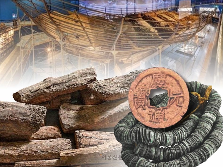 최근에는 무게 28t에 이르는 800만개의 중국 동전과 1017점의 최고급 목재 자단목에 대한 호기심이 커졌다. 동전은 후한(25~220년)의 ‘오수전’부터 원나라 ‘지대통보’까지 1300년 동안 중국에서 만들어진 것이 망라됐다. 동전의 쓰임새로는 “불상 조성용”이라는 주장에 눈길이 간다. 실제로 신안선의 중국 동전과 일본 가나가와 고토쿠인(高徳院)의 가마쿠라 대불은 금속 성분이 비슷하다고 한다. 당시에는 고려에서도 중국 동전을 수입해 불교 의례용구를 만들었다는 우리 학계 연구 결과도 있다.