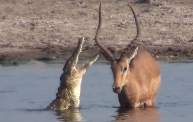 영상에는 강물 위에 서 있는 임팔라를 악어 한 마리가 조심스럽게 탐색하는 모습이 담겼다. 얼굴을 물 밖으로 쭉 빼고 임팔라의 냄새를 맡던 악어는 이내 날카로운 이를 드러내며 임팔라의 목을 물려고 시도한다.