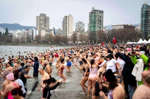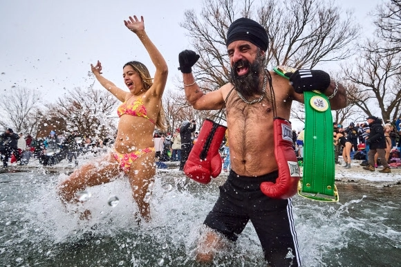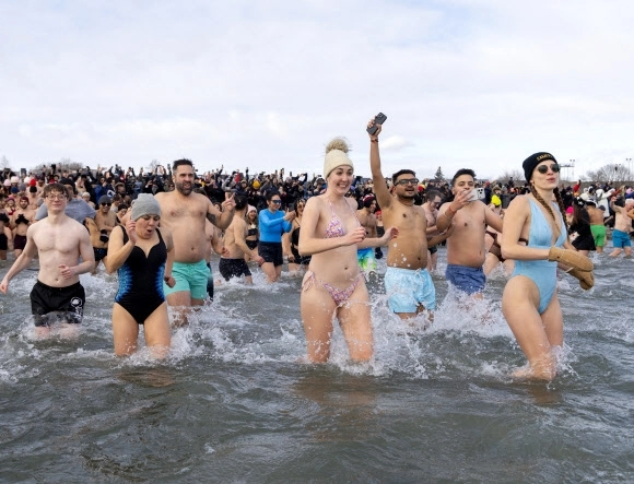‘토론토 북극곰 수영 대회’ 참가자들이 1일(현지시간) 캐나다 토론토의 온타리오 호수로 뛰어들고 있다.