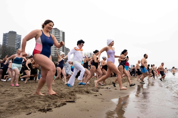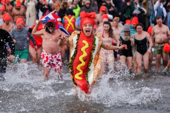 수백 명의 사람들이 2026년 새해를 축하하고 자선 기금을 모으기 위해 차가운 물에 몸을 담갔다.