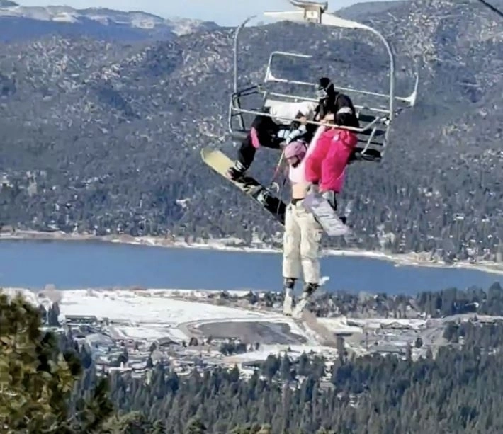 미국 캘리포니아주 빅베어 마운틴 리조트에서 룰라 드 미란다-아르세가 리프트에 매달려 있는 가운데 쌍둥이 자매 레이즐과 친구 마케나 듀믈라오가 그녀를 붙잡고 있다. 인스타그램 캡처