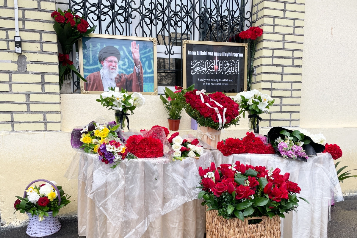 4일 우즈베키스탄의 이란 대사관 앞에 지난 2월 28일 미국과 이스라엘의 이란을 대상으로 군사 작전으로 사망한 이란 최고지도자 지도자 알리 하메네이를 추모하는 꽃들이 놓여 있다. 타슈켄트 타스 연합뉴스