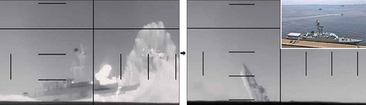 4일(현지시간) 스리랑카 영해 인근 해상에서 미국 해군 고속공격잠수함이 발사한 어뢰에 이란 해군 호위함 ‘아이리스 데나’호가 침몰했다. 미 국방부는 “2차 세계대전 이후 어뢰로 적군 함정을 격침한 첫 사례”라고 밝혔다. 왼쪽 사진은 어뢰 폭발 직후 전함 주변으로 불길과 물기둥이 치솟는 모습이고, 오른쪽 사진은 침몰 과정에서 전함 일부가 수면 위로 드러난 모습이다. 오른쪽 상단 작은 사진은 2023년 2월 28일 브라질 리우데자네이루 항구에 정박한 아이리스 데나호의 원래 모습.