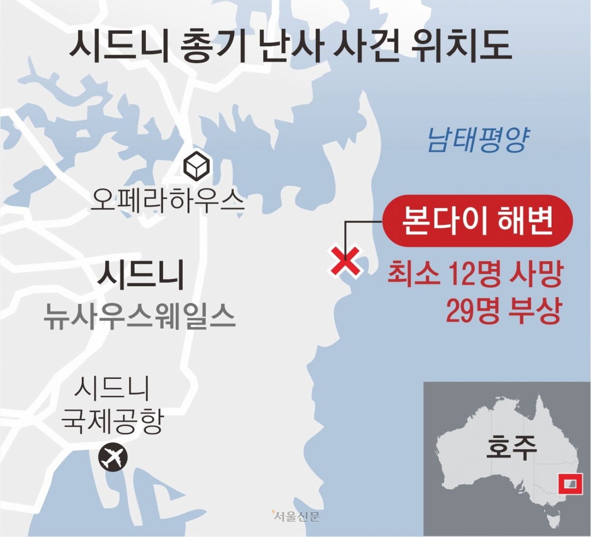 이번 사건은 호주가 총기사고에서 비교적 안전한 나라로 꼽혀왔다는 점에서 현지는 더 큰 충격을 받은 모습이었다. 호주는 1996년 35명이 사망하는 ‘포트 아서 총기난사 사건’ 이후 총기 규제를 강화해 관련 면허가 있어야만 총기 소지가 가능하다. 민스 주총리는 “호주는 대규모 총격사건이 드물기 때문에 더욱 충격적”이라며 “향후 필요한 대책을 마련하겠다”고 말했다.