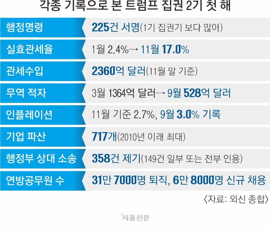 NYT “공무원 줄어 공공서비스 약화”도널드 트럼프 미국 대통령 2기 집권기 첫 해는 어땠는가. 미 주요 언론들이 연말을 맞아 잇따라 트럼프 대통령의 지난 1년을 돌아보는 등 평가에 나섰다. 올 한해 지구촌을 달군 그의 관세 정책에 대해선 미 연방정부의 수입 증대를 이끌었다면서도 인플레이션과 수입 의존도가 높은 기업의 파산 등 부작용을 일으켰다고 진단했다. 트럼프 대통령의 또 다른 핵심 정책인 반이민 정책 등은 수많은 법적 분쟁을 야기했다고 분석했다.