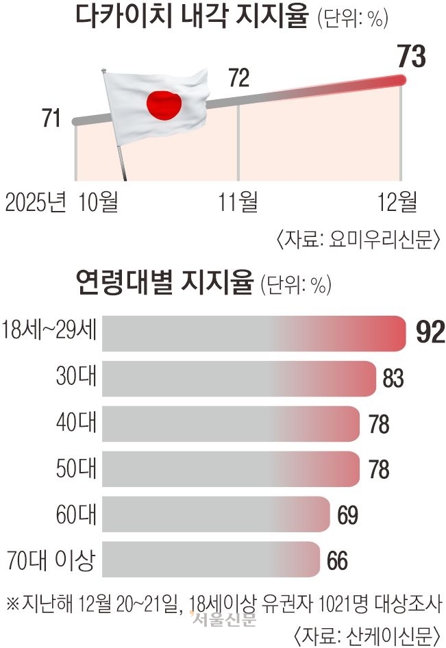이처럼 특정 정당을 넘어 젊은 세대 전반으로 확산된 지지는 다카이치 내각이 강경한 정치·외교 메시지를 유지할 수 있는 정치적 완충 장치로 작용하고 있다는 분석도 나온다. 실제 중일 갈등을 촉발한 대만 유사시 발언을 둘러싼 논란 속에서도 다카이치 총리가 발언 철회 카드를 선택하지 않은 배경에는 젊은 층을 중심으로 한 안정적인 지지 기반이 깔려 있다는 평가다.