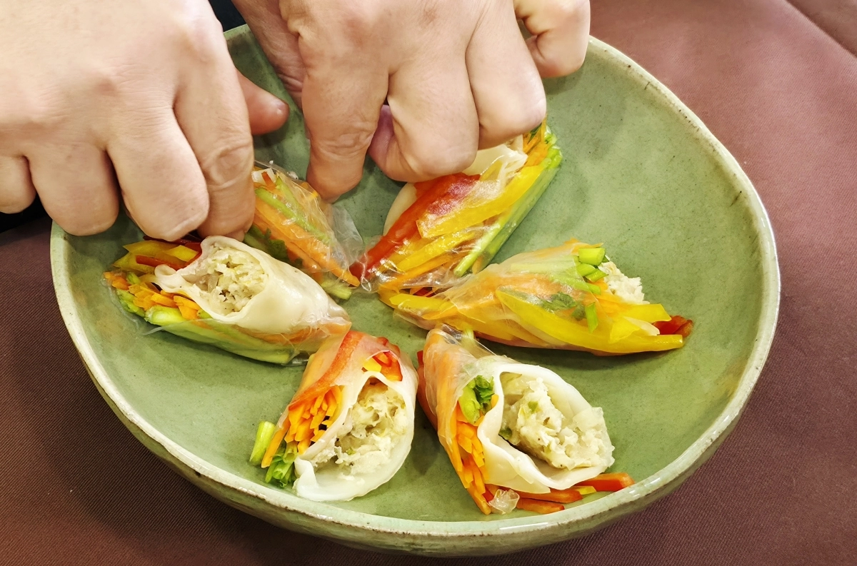 사찰식 왕만두를 당근, 쑥갓 등 채소와 함께 라이스 페이퍼로 싼 왕만두 쌈채.
