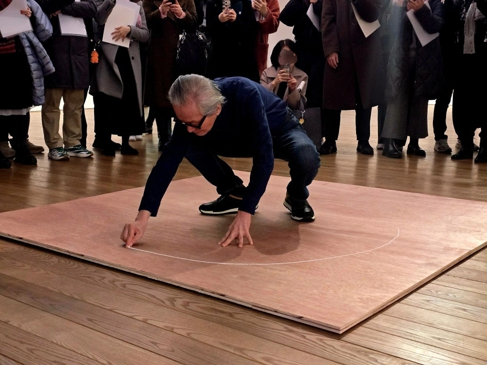 지난 4일 전시장을 찾은 작가는 1975년 홍익대 운동장에서 선보였던 퍼포먼스 ‘장소의 논리’를 재연했다. 작가는 분필을 들고 진중한 표정으로 가로, 세로 2m 크기의 널빤지 위에 섰다. 이어 몸을 컴퍼스 삼아 큰 원을 그려냈다. 원 밖으로 나온 작가는 원 안을 가리키며 “저기, 저기, 저기”라고 외쳤다. 이어 원 안으로 들어가더니 아까와 같은 장소를 가리키며 “여기, 여기, 여기”라 했다. 원을 등진 채 빠져나온 뒤에는 어깨 너머에 있는 또 같은 지점을 가리키며 “거기, 거기, 거기”라고 말했다. 이후 원을 따라 밟으며 “어디, 어디, 어디”라 했다.