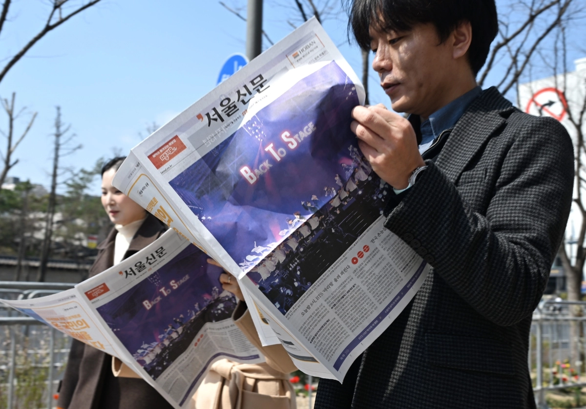 방탄소년단(BTS)의 광화문 컴백공연을 하루 앞 둔 20일 서울시 중구 태평로 서울신문사 앞에서 호외로 제작된 서울신문 BTS 특별판을 외국인들과 시민들이 받아가고 있다.