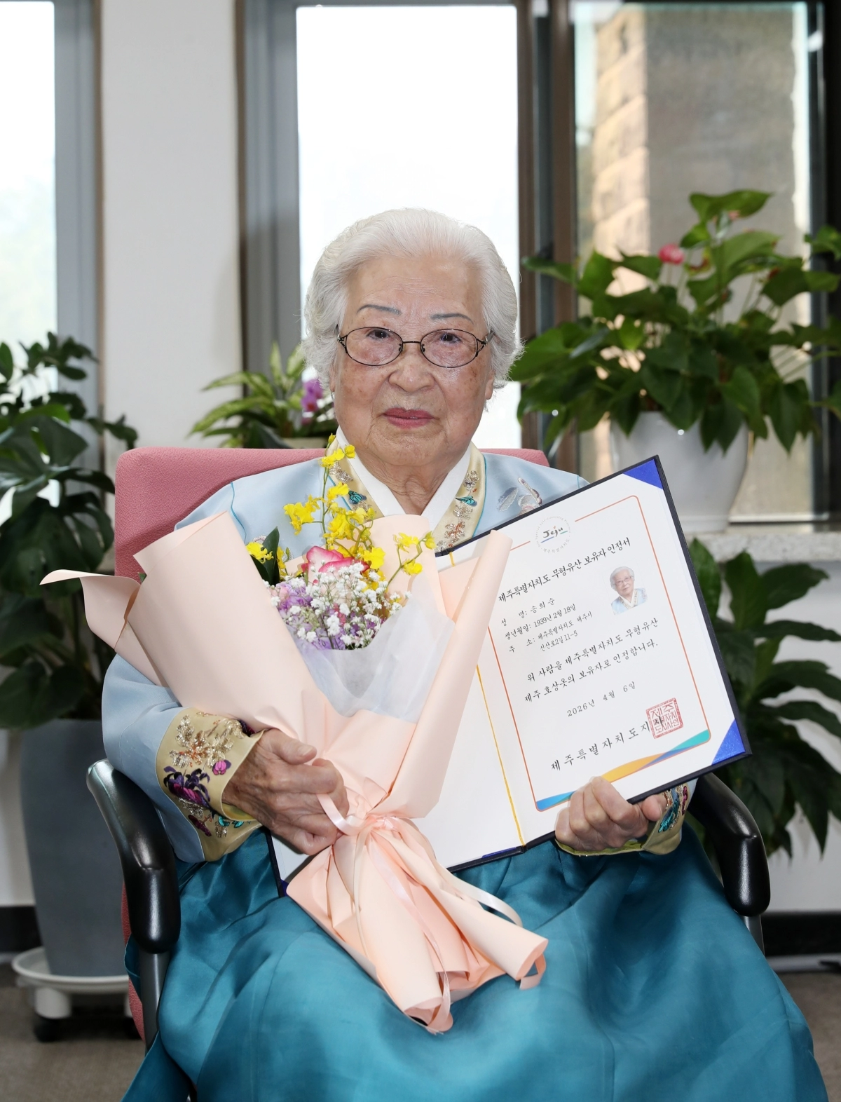 제주도는 7일 도청에서 제주도 무형유산 ‘제주 호상옷’ 신규 보유자로 인정된 송희순(86·제주시 신산로2길) 씨에게 인정서를 수여했다고 밝혔다.