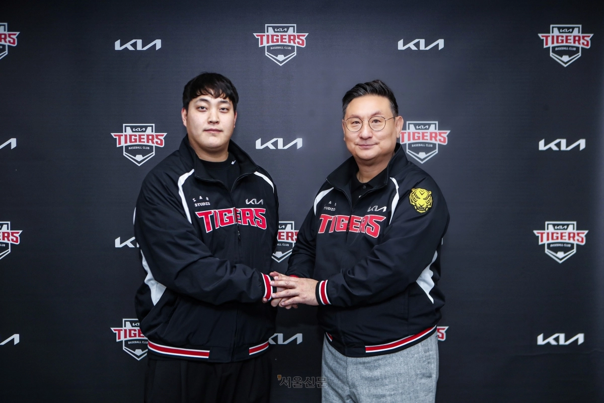 조상우(왼쪽)가 21일 광주 기아 챔피언스 필드에서 심재학 단장과 자유계약선수(FA) 계약을 체결한 뒤 기념 사진 촬영을 하고 있다. 2026.1.21 KIA 타이거즈 제공