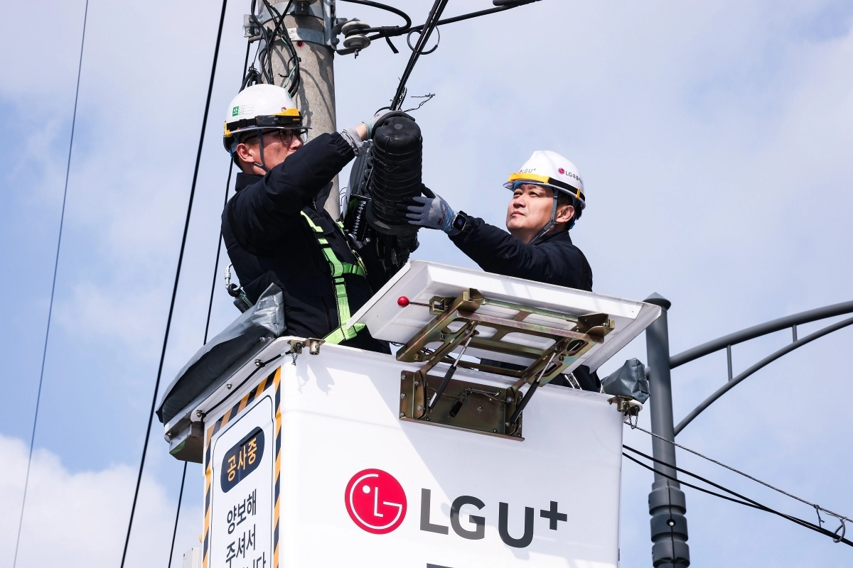 홍범식 LG유플러스 최고경영자(CEO)가 지난 12일 서울 마포구 네트워크 점검 현장에서 전봇대나 건물 외벽 등의 통신 설비를 점검하는 버킷 차량에 직접 탑승해 광접속함체를 점검했다고 LG유플러스가 15일 밝혔다.