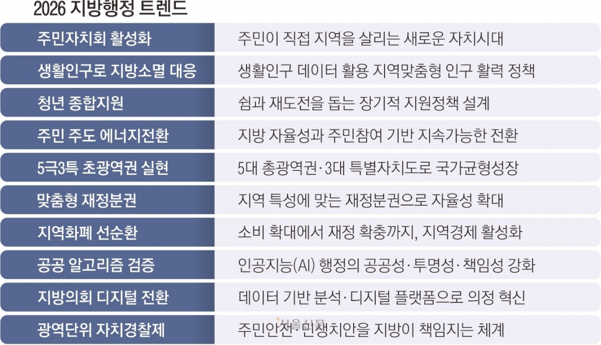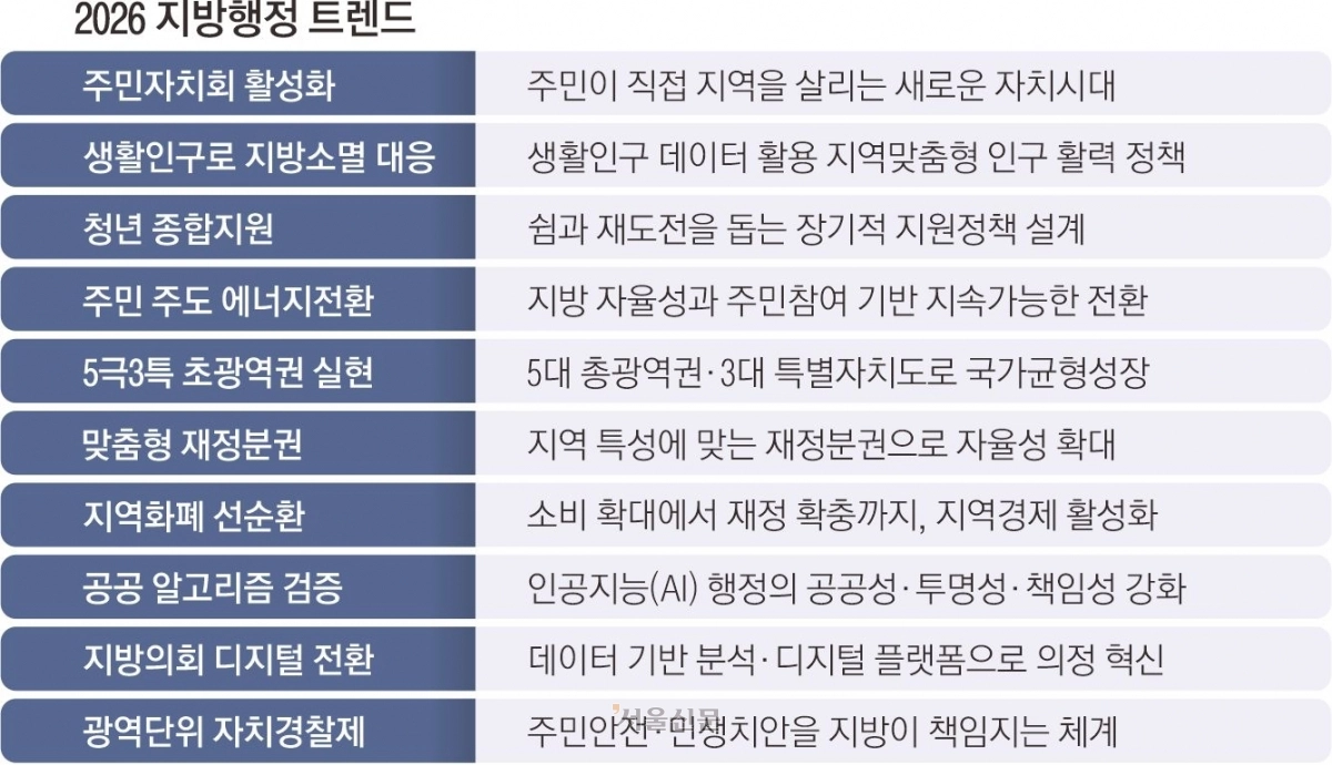 연구원이 뽑은 내년도 10가지 트렌드는 ▲주민자치회 활성화 ▲생활인구 기반 지방소멸 대응 ▲청년의 쉼과 재도전을 돕는 종합지원 ▲지역 주민 주도 에너지대전환 ▲5극3특 초광역권 실현 ▲맞춤형 재정분권 ▲지역화폐 선순환 ▲AI 행정의 공공 알고리즘 검증 ▲지방의회 디지털 전환 ▲광역단위 자치경찰제이다.