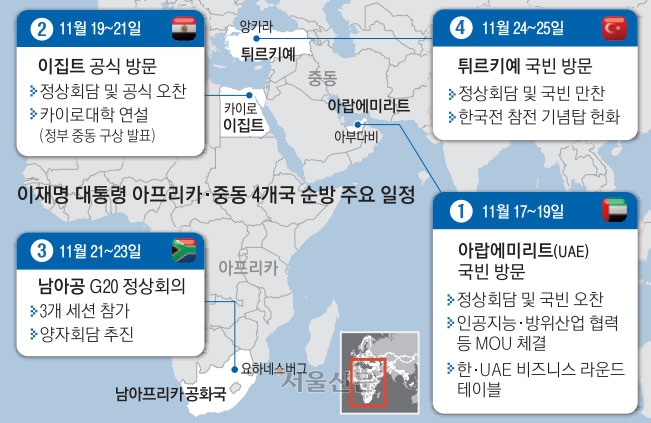 이집트에서는 압둘팟타흐 시시 대통령과 정상회담을 한 뒤 카이로대에서 연설을 통해 정부의 중동 구상을 발표할 계획이다. 남아공에서는 G20 정상회의 3개 세션에 참석해 포용적이고 지속 가능한 성장, 기후변화와 재난, 공정한 미래 등에 관해 논의한다.