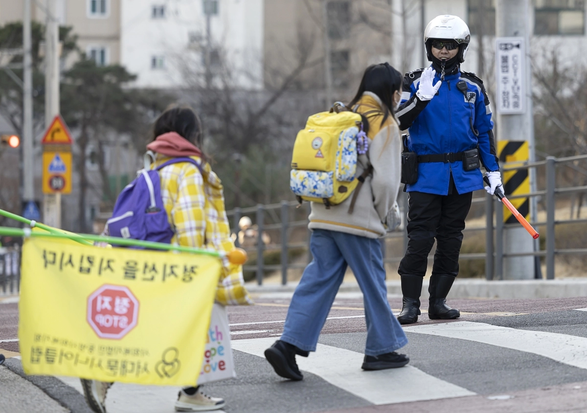 3일 오전 서울 서대문구 연가초등학교 앞에서 경찰이 ‘새 학기 등교 스쿨존 특별단속’중 학생과 인사를 하고 있다. 2023.3.3 연합뉴스