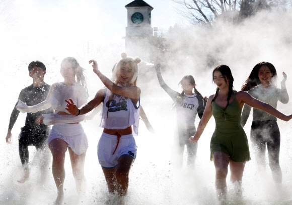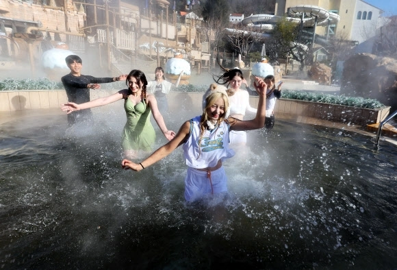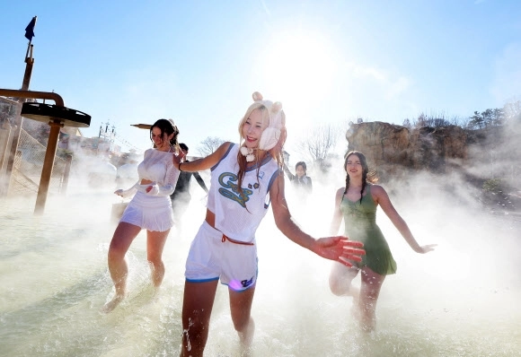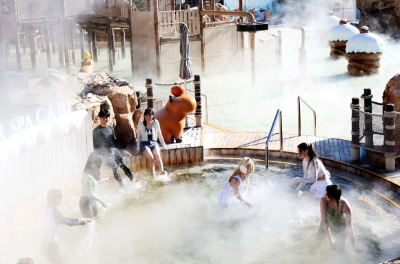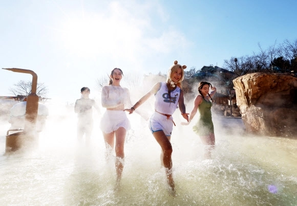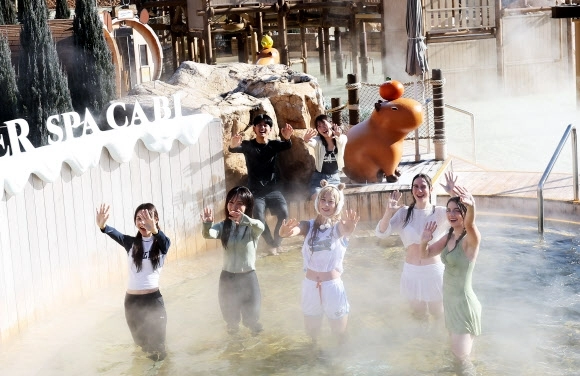 한파가 이어지고 있는 4일 경기도 용인시 캐리비안베이에서 모델들이 카피바라 테마로 꾸며진 편백 나무 노천탕과 핀란드식 원통 사우나 등 ‘윈터 캐비 스파’를 즐기고 있다.