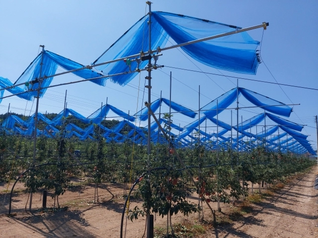 과수 주산지인 경북 의성군이 여름철 과일의 폭염 피해를 줄이기 위해 개발해 특허를 획득한 과수용 ‘커튼형 햇빛 차단망’. 의성군 제공