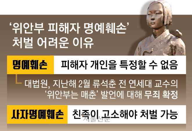 사자명예훼손 혐의도 적용하기 쉽지 않다. 사자명예훼손은 허위 사실로 고인의 명예를 훼손한 경우 적용할 수 있지만, 친고죄로 규정돼 유족의 고소가 있어야 공소 제기가 가능하다. 강경란 정의기억연대 연대운동국장은 “돌아가신 위안부 할머니들은 대부분 혈혈단신으로 자식이나 친척이 없는 경우가 많아 고소가 어렵다”고 했다.