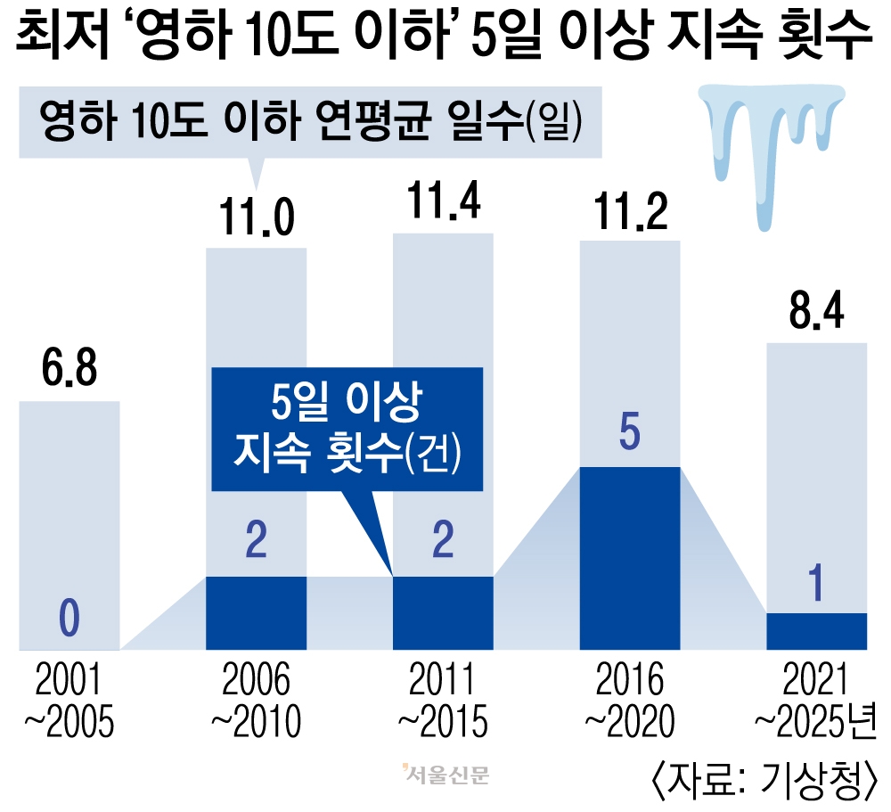 19일 서울신문이 1986년부터 2026년까지 40년치 서울 지역 기상 자료를 분석한 결과, 아침 최저기온이 영하 10도 이하로 떨어지는 추위가 5일 이상 이어지는 횟수가 2010년을 기점으로 크게 늘었다. 1986년부터 2010년까지 25년 동안 3차례에 불과했던 5일 이상 한파는 2011년 이후 8번을 기록했다. 발생 수가 과거 대비 1.6배 이상, 연간 발생 빈도는 2.7배 이상 급증한 것이다.