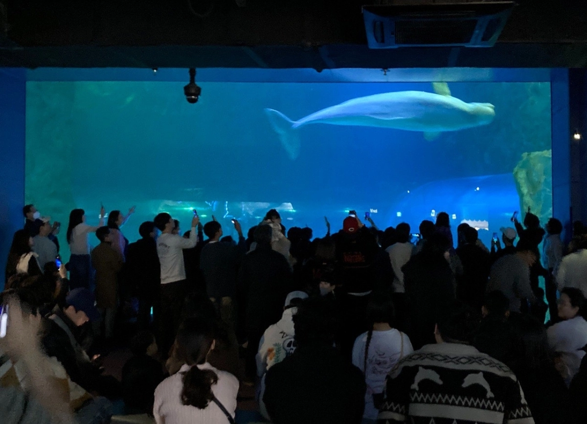 서울 잠실 롯데월드 아쿠아리움의 좁은 수조에 갇힌 여성 흰고래 ‘벨라’는 관람객들의 환호성 및 수조 벽을 두드릴 때 생기는 커다란 소음과 스트레스에 항시 노출되어 있다. 핫핑크돌핀스 제공