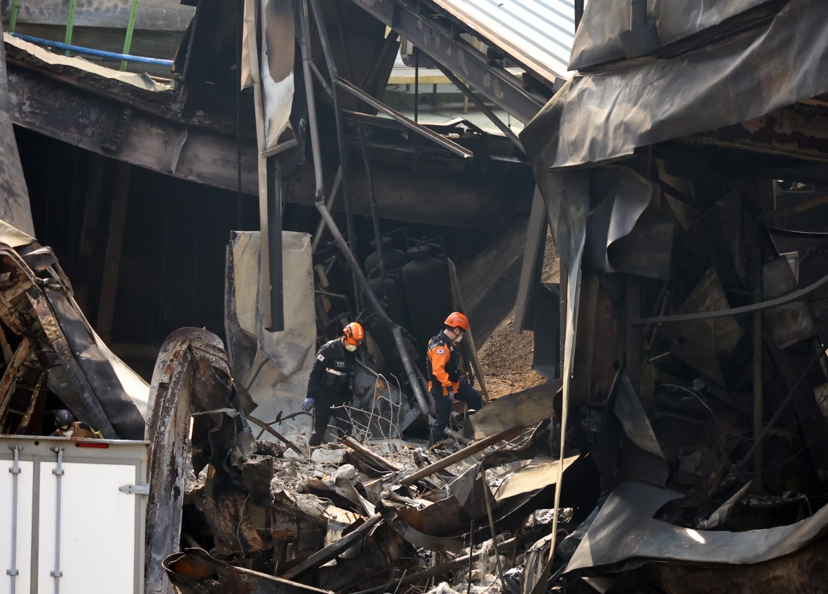 24일 대전 대덕구 소재 자동차 부품 제조업체인 안전공업 주식회사 2일 차 감식에 나선 소방 당국 관계자들이 불에 탄 건물 안으로 진입하고 있다. 연합뉴스