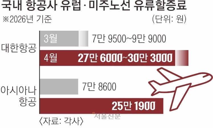 대한항공의 인천-뉴욕 왕복 기준 유류 할증료는 3월 발권 기준 19만 8000원에서 4월에는 60만 6000원으로 3배로 인상된 상황인데, 33단계로 책정된다면 5월에는 최대 100만원까지 부과될 수 있다.