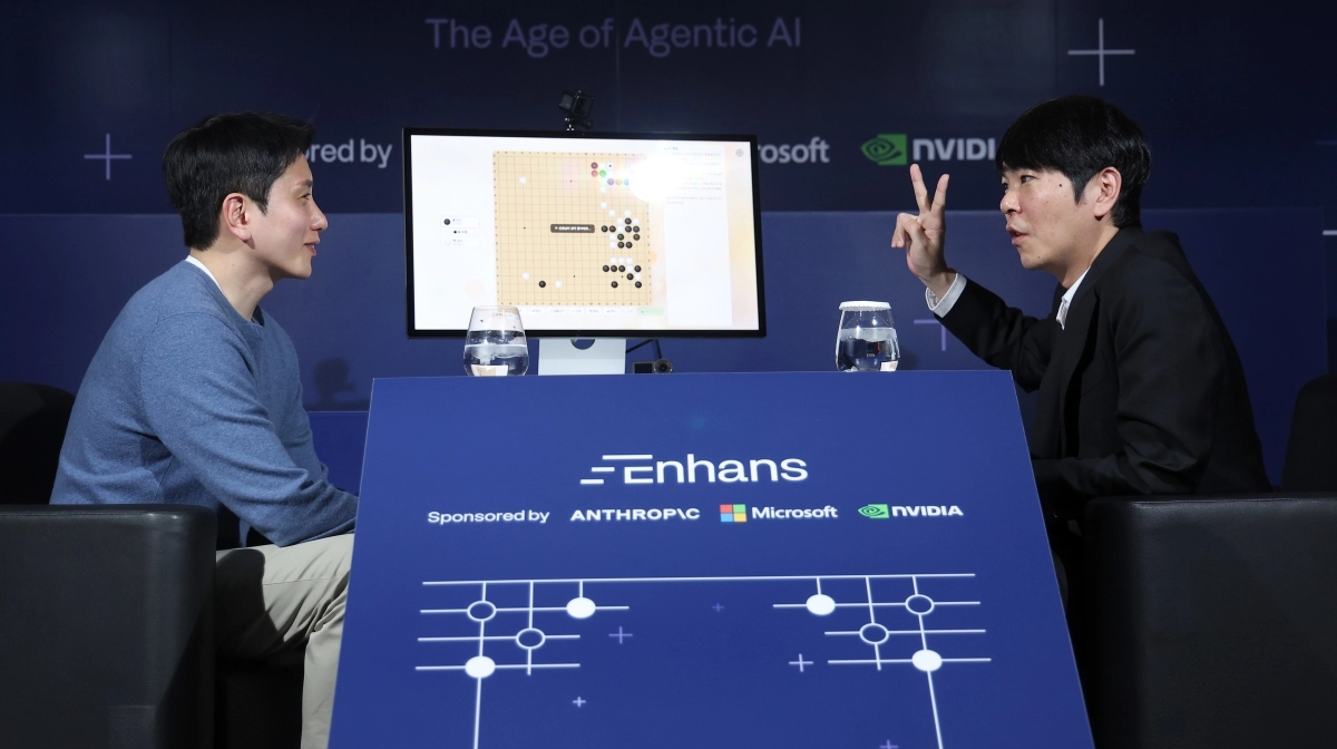 바둑 기사 이세돌 9단이 9일 서울 종로구 포시즌스 호텔에서 AI 스타트업 인핸스가 주최한 ‘에이전틱 AI 상용화 글로벌 캠페인’에 참석해 에이전틱 AI로 제작한 바둑 모델을 시연하며 이승현 인핸스 대표와 이야기를 나누고 있다.