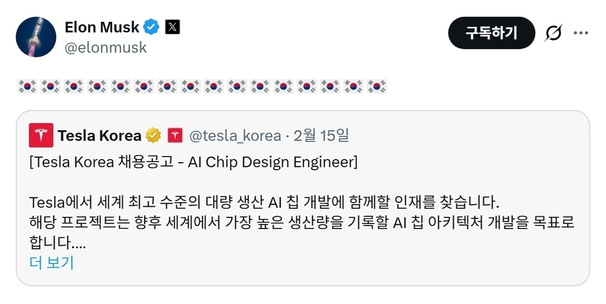 일론 머스크 테슬라 최고경영자(CEO)는 16일(현지시간) 소셜미디어(SNS) X(엑스·옛 트위터)에 여러 개의 태극기 이모티콘과 함께 테슬라코리아의 한국 내 반도체 인력 관련 채용공고를 공유했다. 2026.2.16 엑스