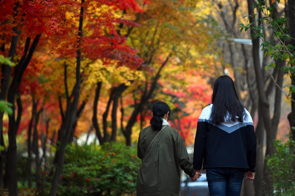 윤슬(오른쪽)씨와 어머니 김수현(가명)씨가 단풍나무 아래를 함께 걷고 있다.