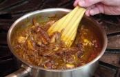 만드는 법 (1)냄비에 물을 붓고 양파 100g과 월계수잎을 넣은 다음 약한 불로 끓여 문어를 익혀낸다.(2)끓는 물에 토마토를 30초 동안 넣었다 꺼내서 찬물에 헹궈 껍질을 벗긴 다음 잘게 채썬다.(3) (1)의 문어를 꺼내 물을 빼고 칼로 먹음직한 크기로 자른다.작은 문어는 대가리를 같이 썰어 넣어도 되지만 큰 문어는 머리 부분을 따로 떼낸다.(4)팬에 오일을 두르고 달군 다음 문어·남은 양파·마늘을 넣고 3분가량 볶는다.토마토·설탕·꽃박하·파슬리·적포도주와 식초를 넣고 걸쭉해질 때까지 저으며 익힌다.(5)팬의 뚜껑을 덮고 아주 약한 불에서 소스가 걸쭉해지고 문어가 부드러워질 때까지 익힌다.가장 약한 불로 익힐 경우 1시간가량 걸린다.(6)접시에 (5)를 담고 허브·잣을 고명으로 올려 차려낸다.