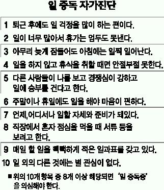 ‘일 중독증’환자들은 일이 없는 주 5일제는 물론 휴일이나 휴가가 두려우며,일을 떠나야 하는 퇴직은 치명적이다.이들은 대부분 직장내에서의 업무 수행능력은 인정받지만 그 사이 중독증이 진행돼 결국 돌이킬 수 없는 상태에 이르게 된다.
