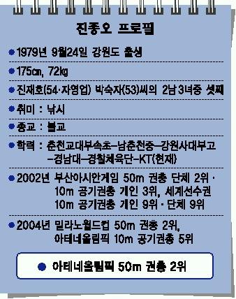 진종오는 이상도(26·창원경륜공단)와 함께 한국 권총을 이끈 쌍두마차.한국 권총이 세계적인 수준과 격차가 있어 일반인에게는 잘 알려지지 않았다.2002부산아시안게임 50m 권총 단체 2위·개인 3위,지난 6월 밀라노월드컵 50m 권총 개인 2위가 국제대회 성적의 전부.태극마크도 지난 2002년 4월에야 달았다.