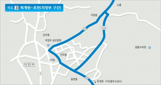 축석고개에서 4㎞ 정도 직진,우측으로 의정부성모병원을 바라보며 좌회전하면 새로 뚫린 6차선 국도 43번 우회도로를 이용해 퇴계원 방향의 43번 국도를 타도 시내 체증을 피할 수 있다.(약도(3))