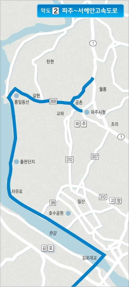 파주 파주읍과 탄현면,양주 서부지역에서 서해안고속도로나 서울외곽순환고속도로∼경부고속도로에 진입할 때 일산신도시와 1번국도의 체증을 피하는 방법으로 지난 6월말 4차선으로 준공된 368번 지방도(연장 6.7㎞,약도 (2))를 이용해 볼 만하다.이 도로를 이용해 통일동산을 거쳐 자유로에 연결,김포대교를 넘으면 된다.