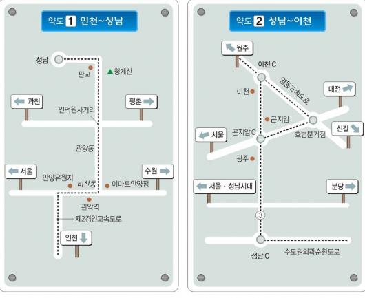 시내도로와 고속도로를 번갈아 이용하는 등 머리를 써야 한다.일단 제2경인고속도로(인천∼안양)를 탄 뒤 고속도로이용정보(1588-2505)를 들어 수도권외곽순환도로 시흥∼성남 구간이 막히지 않으면 안현분기점에서 수도권외곽순환도로로 옮겨탄 뒤 성남으로 간다.문제는 수도권외곽순환도로 평촌∼판교 구간이 막힐 때가 많다는 것.이 때는 막히는 경우가 거의 없는 제2경인고속도로를 타고 그대로 종점인 안양까지 간 뒤 시내도로로 비산동∼관양동∼인덕원∼판교를 거쳐 성남으로 간다.(약도 (1))
