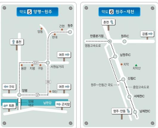 용문 또는 대신을 경유해 원주로 가는 2가지 방법이 있는데 모두 이정표가 잘 되어 있지 않아 주의를 기울여야 한다.첫번째 경우 일단 양평∼홍천간 도로를 통해 용문까지 간다.용문읍을 벗어나자마자 우측으로 나 있는 331번 지방도를 타고 지평·구둔을 지나 서원리 삼거리에서 좌회전,88번 지방도를 타고 판대·간현을 지나 원주로 간다.이 길은 이정표상에 ‘원주’가 표기돼 있지 않은데다 잘 알려지지 않아 막히는 법이 없다.두번째 방법은 양평에서 37번 국도를 통해 대신까지 간 뒤 88번 지방도를 타면 용문 방향과 만나는 서원리 삼거리가 나온다.여기서부터는 위와 같이 판대·간현을 거쳐 원주로 간다.(약도 (5))