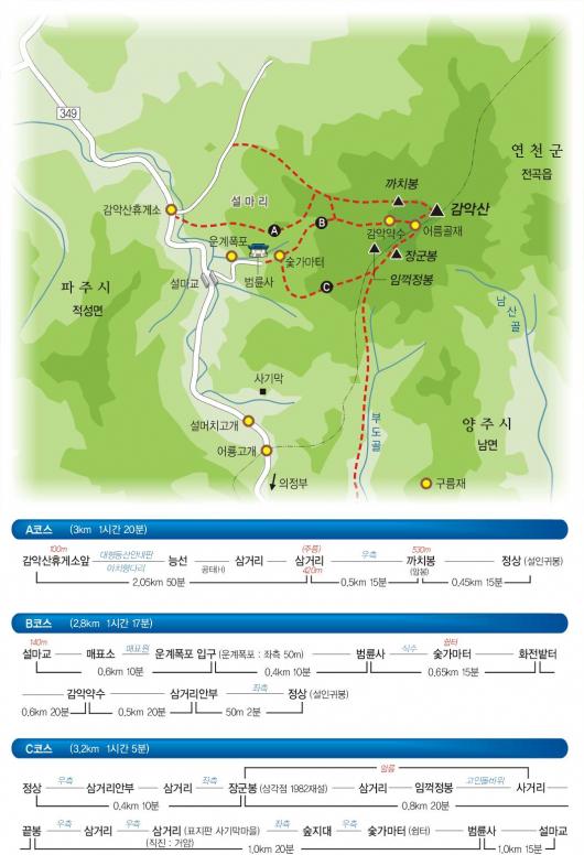 ●가는 길:3호선 불광역앞 시외버스터미널에서 적성행 버스를 타고 적성터미널에서 감악산휴게소로 가는 의정부행 버스를 타면 된다.불광역에서 2시간이 채 걸리지 않는다.승용차로는 구파발을 거쳐 벽제 문산을 거쳐 적성으로 가면 된다.