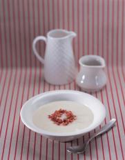 만드는법 (1) 양파는 껍질을 벗겨 채썬다.(2) 팬에 버터 1큰술을 넣고 삶은 감자와 채썬 양파를 볶다가 물 1컵과 우유 2컵을 넣는다.(3) (2)를 믹서에 넣고 곱게 간다.(4) 베이컨을 팬에 바삭하게 익힌다.(5) 갈아놓은 재료를 냄비에 넣고 끓이다가 생크림을 넣고 불을 끈다.(6) (5)에 후춧가루를 뿌리고 소금으로 마지막 간을 한 다음 베이컨을 올려낸다.