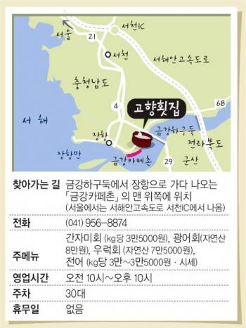 광어나 우럭회 1㎏을 시키면 생대합,왕새우,멍게,키조개 눈,소라 등 싱싱하고 푸짐한 곁가지 음식과 함께 간자미 회가 나온다.3∼4명도 충분하다.간자미 회를 시키면 소라,왕새우 등만 나와 2인분 정도로 빈약해진다.이 집은 주로 자연산을 취급하고 있다.가을로 접어든 요즘에는 한창 생산되는 전어도 회나 구이 등으로 맛볼 수 있어 일석이조의 맛기행으로 제격이다.