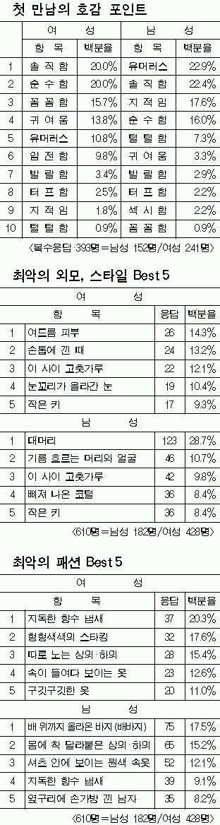 첫인상이 좋으면 만남의 절반은 성공한 셈. 작정하고 퇴짜맞을 생각이 아니라면 외모에 신경써야 하는 것은 당연하다. 여성은 이왕이면 고운 피부와 깔끔함을 내세우자. 여드름(14.3%), 손톱에 낀 때(13.2%), 이 사이의 고춧가루(12.1%)를 마이너스 요소로 찍고 있으므로.