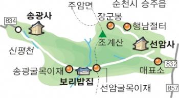 전라남도 순천 조계산 산중에 정말 맛있는 보리밥집이 있다는 소문을 듣고 직접 확인을 하기 위해 찾아갔다. 조계산(884m)은 남동쪽에 태고종 고찰 선암사, 북서쪽에 조계종 송광사를 품고 있는 명산이다. 조계산 굴목이재는 선암사와 송광사를 잇는 길로 해발 600고지에 문제(?)의 보리밥집이 있다고 한다.
