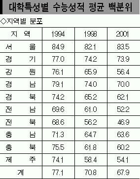 서울 소재 대학의 수능평균 백분위(만점 100점)는 수능시험이 처음 치러진 1994년 84.9점,1998년 82.1점,2001년 83.5점으로 일정 수준을 유지했다.