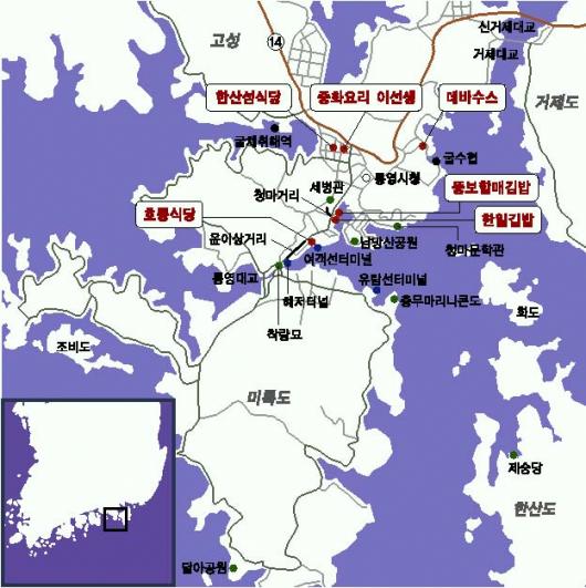 대전∼진주 고속도로를 끝까지 간 다음 남해고속도를 타고 순천방향으로 가다 사천IC에서 빠진다. 다시 33번 국도를 타고 사천으로 가다 17번 국도 고성을 거쳐 통영으로 들어간다. 서울에서 통영까지 5∼6시간 걸린다.